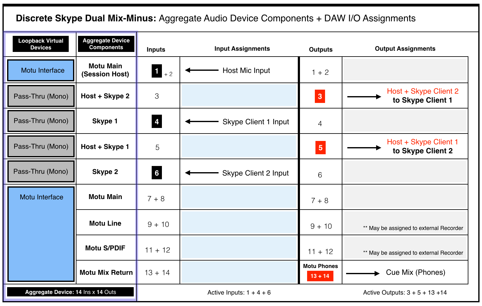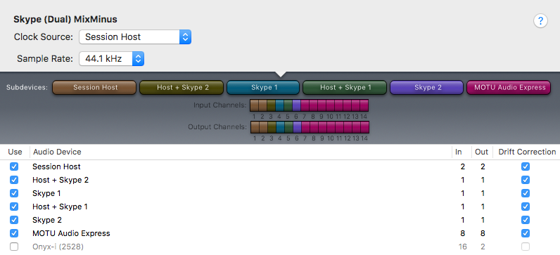 The image below displays a user defined Aggregate Audio Device created in OSX using the Audio MIDI Setup utility. It is named Skype (Dual) MixMinus. Notice how I’ve selected the Virtual Devices created in Loopback as Subdevices. Also notice how each Subdevice accurately displays input and output I/O mapping for a total of 14 inputs + 14 outputs. This matches the configuration displayed in the I/O Matrix table diagram above. The Aggregate Audio Device is now ready for DAW integration.