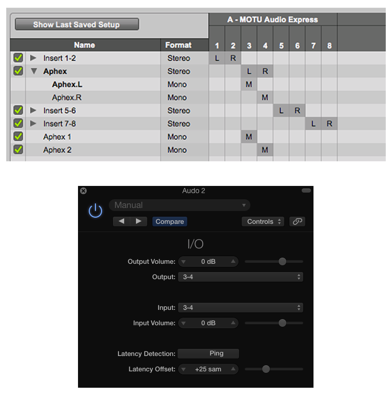 • A secondary Motu instance is created with all available inputs/outputs mapped for use (8×8 by default). This will supply additional routing flexibility for monitoring and external recording. In fact the I/O Matrix table displays the use of outputs 13+14 for the Cue Monitor Mix (Phones).