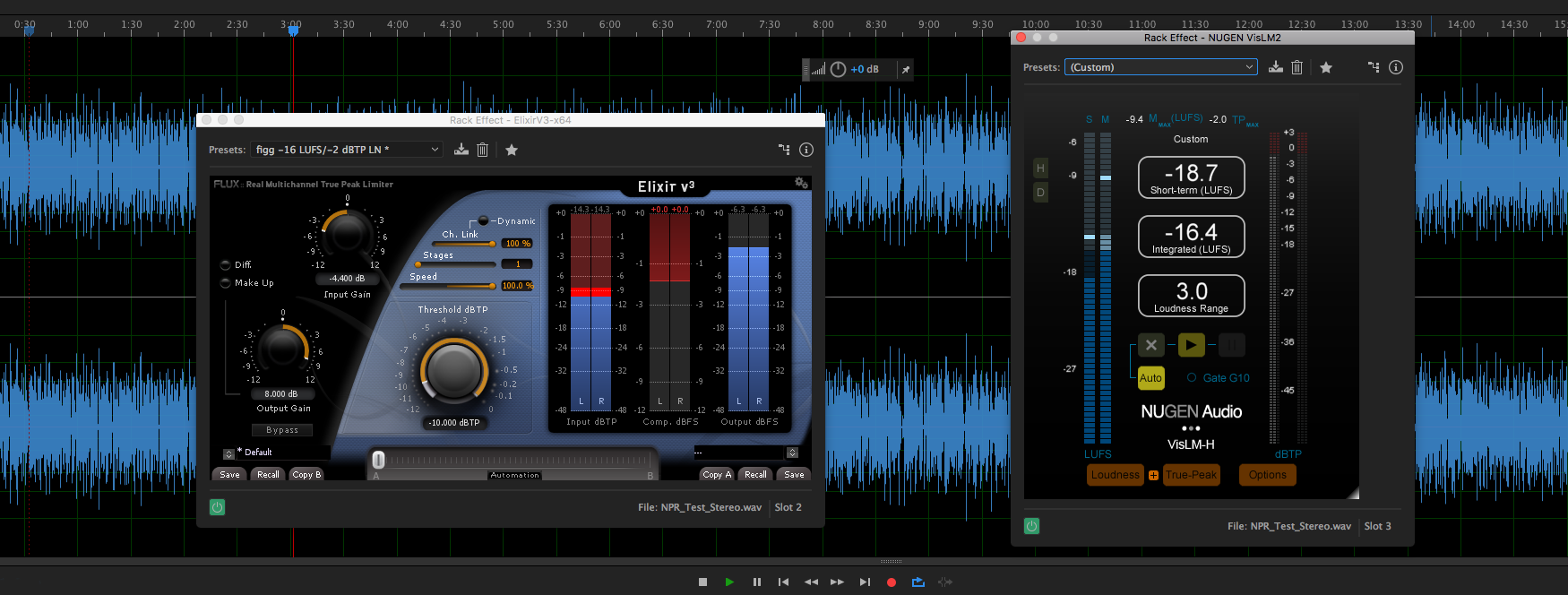 Two audio plugins are inserted on each Skype Client input Channel Strip (Downward Expander and Limiter). The Expanders will transparently attenuate the inactive input. The Limiters will function as a safeguard thus preventing unexpected signal level overload. Plenty of headroom is maintained. In essence the Limiters will rarely engage.