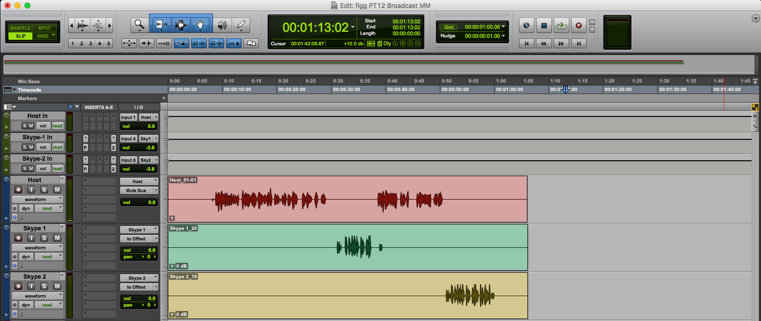 After launching and configuring the Skype instance(s), arm the DAW’s Host, Skype 1, and Skype 2 audio tracks for recording. Connect with the independent Skype participants. Both participants will be able to converse with each other + the Host. Recording the Session will supply discrete audio files for each participant on their respective tracks.