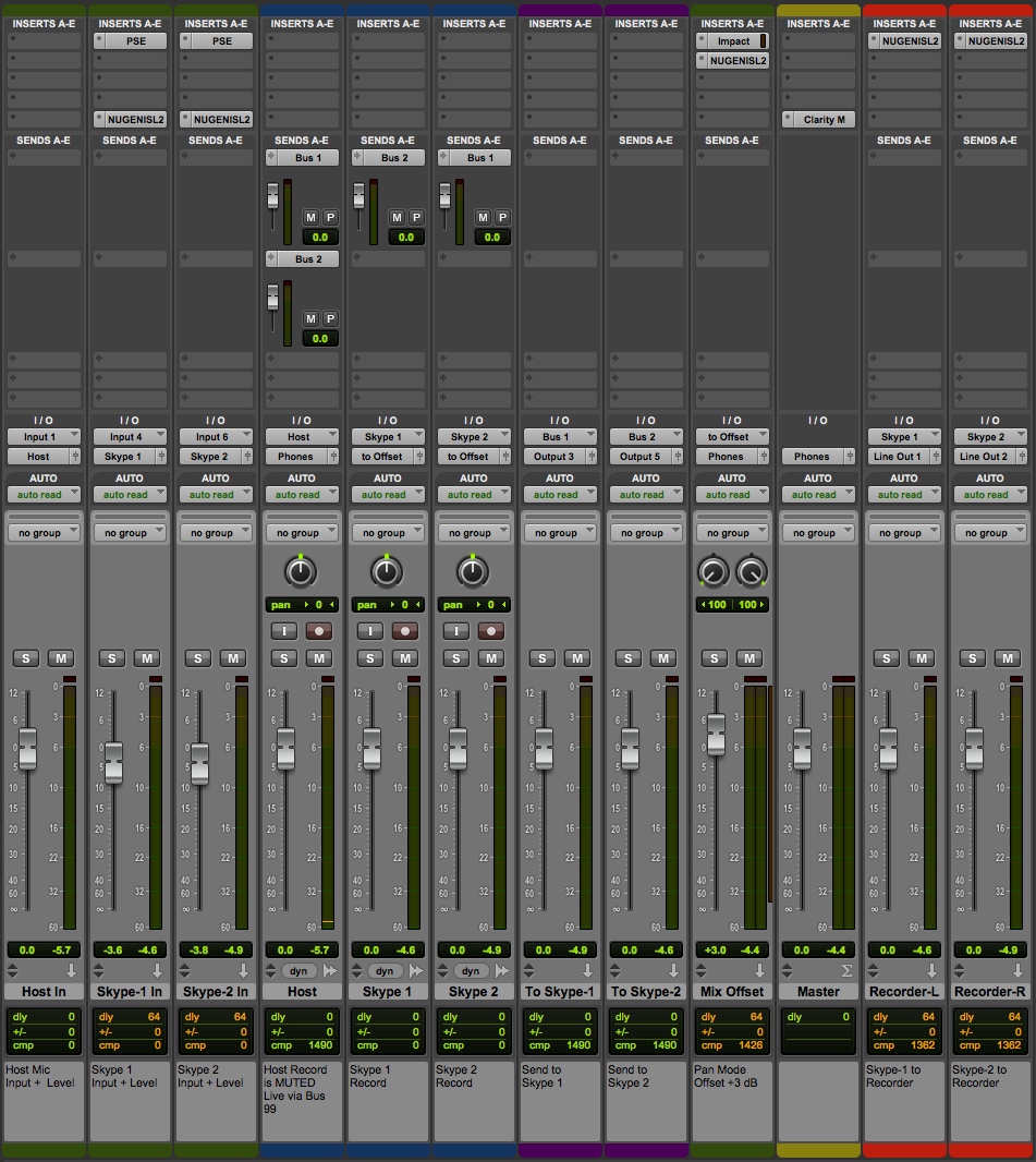 Notice the outputs of the Skype 1 and Skype 2 audio tracks are routed to a stereo Bus labeled to Offset. An Auxiliary Input Channel Strip (Green, labeled Mix Offset) receives the audio from the to Offset virtual Bus. I use the Channel Strip fader to add +3 dB of static gain to reconstitute the previously applied attenuation on the passing signal.