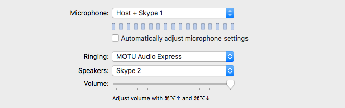 Notice we revert back to independent Virtual Devices created in Loopback for the configuration of this Skype instance. The Host + Skype 2 device is essentially output 3 in the configured DAW. It passes the Host + Skype Client 2 audio to this running instance of Skype.
